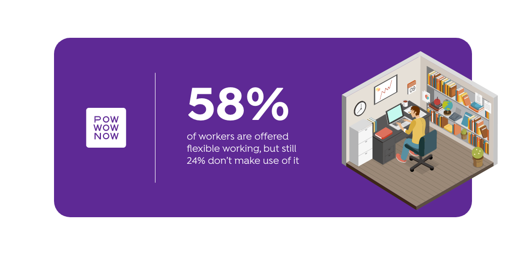 - 58% of workers are offered flexible working, but still 24% don’t make use of it